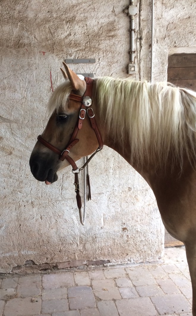 Tammi trägt ihr neues Reithalfter scheinbar gerne, zumindest lässt sie es sich ohne Protest anziehen. Also habe ich noch eine kleine Modifikation vorgenommen. Dieses kleine Teil eines alten Stallhalfters: