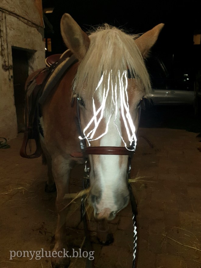 Für Tammis zartes Hinterteil haben wir eine wunderbare reflektierende Ausreitdecke, aber vorne waren wir bisher quasi unsichtbar unterwegs.