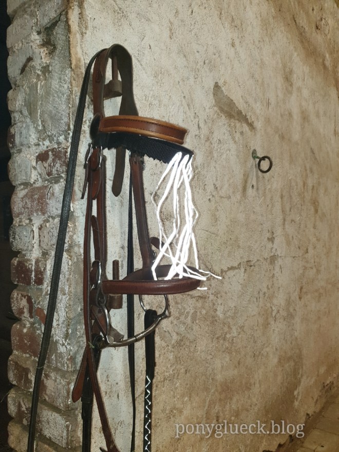 Zu Hause angekommen habe ich mir eines der herumliegenden alten Fransenstirnbänder geschnappt. Ähnlich wie Hufkratzer finden sich davon immer mehrere herrenlose Exemplare auf unserem Hof, die über Jahre ihren Platz in irgendeiner dunklen Ecke nicht verlassen. Einem dieser Exemplare wurde nun also zu einer neuen Existenz im Licht verholfen. Leider musste ich ihm hierfür zunächst alle noch vorhandenen Fransen abschneiden.