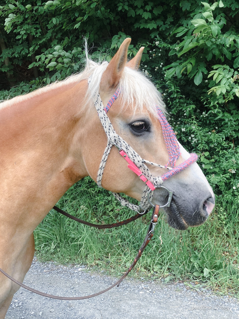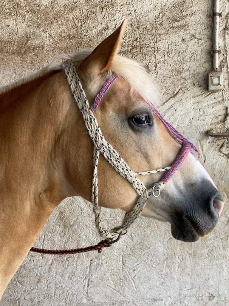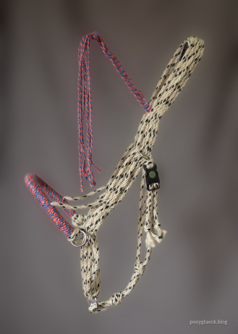 Ich habe also in meinem Kopf einen Mohair-Schnurengurt, die in Osteuropa beliebten Schnurhalfter und meinen geliebten Multizaum zusammengeschmissen, ordentlich gerührt und dieses Wanderreithalfter ist dabei herausgekommen:
