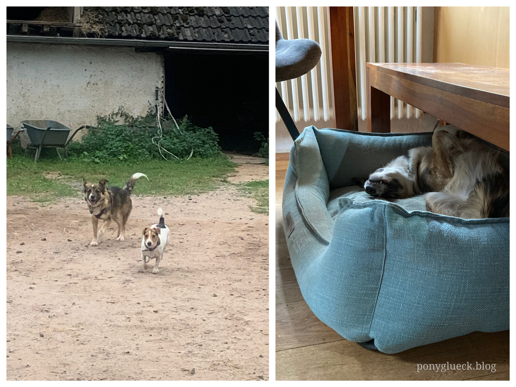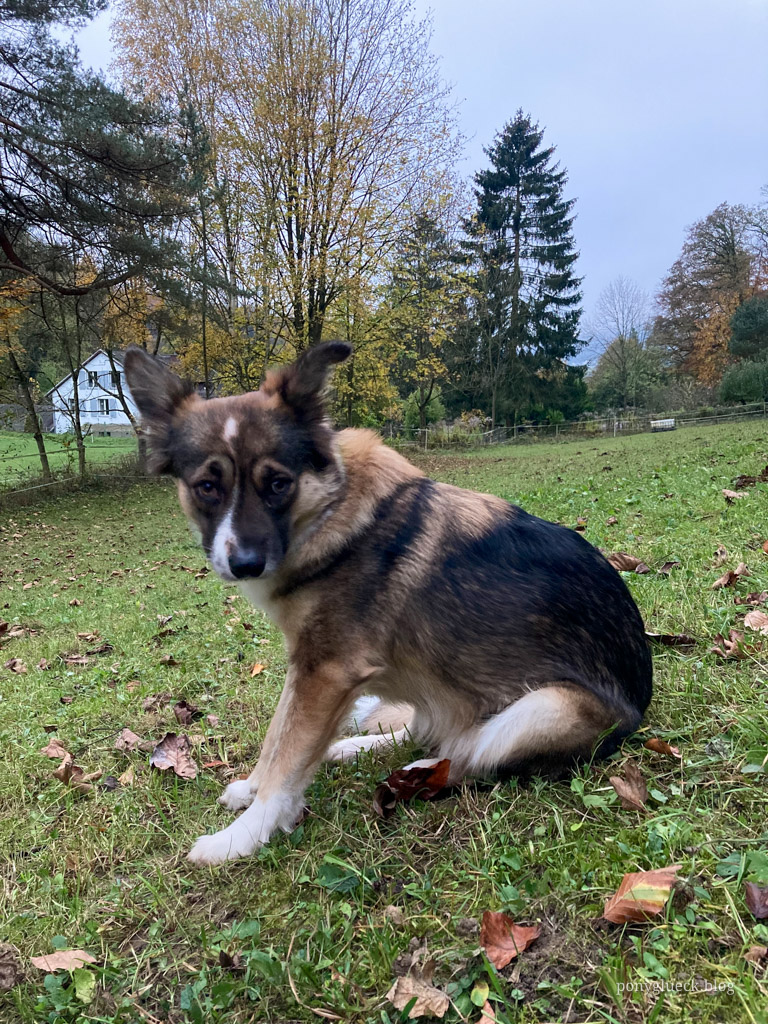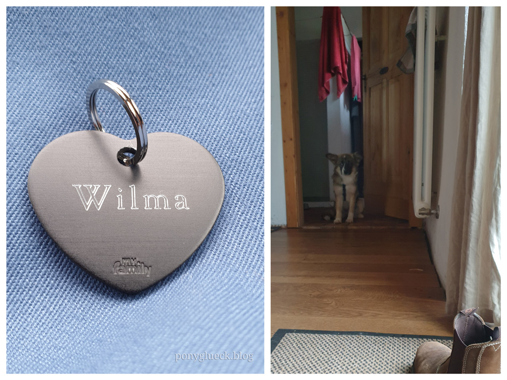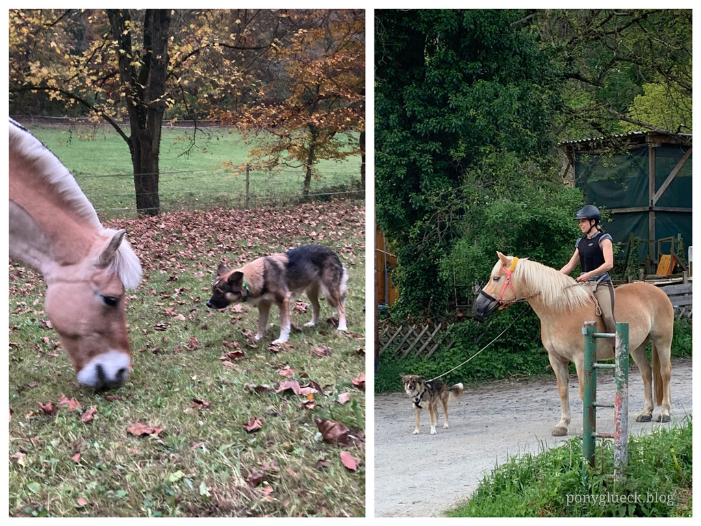 Welch ein Glück, dass Wilma so ein sanftes Wesen hat. In all ihrer Angst hat sie nur in zwei Extremsituationen nach meinem Mann geschnappt. Bisher hat sie sich überwiegend sehr defensiv gezeigt, ist freundlich zu unserer Tochter (vor Kindern hat sie nämlich keine Angst), den Katzen und anderen Hunden. Auch zeigt sie glücklicherweise keinen Jagdtrieb und mit den Pferden kommt sie hervorragend klar. Tatsächlich läuft sie von Anfang an so souverän am Pferd, als ob sie das bereits gelernt hätte.