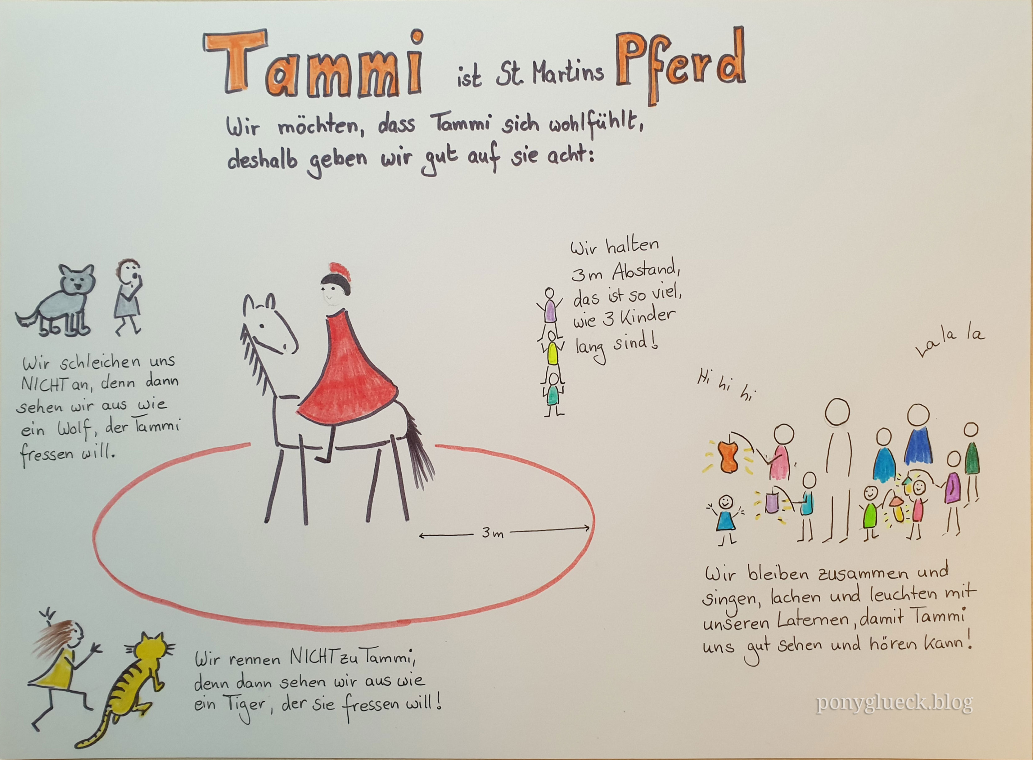 Tatsächlich haben auch wir uns in Eil‘ davon gemacht. Beim letzten Halt, bei dem Sankt Martin sich von den Kindern verabschieden sollte, kam ein unbedarfter Passant dunkel gekleidet aus entgegengesetzter Richtung an uns vorbei geschlichen. Da hat Tammi sich dann doch kurz erschreckt (nicht dramatisch, nur kurz den Kopf hoch gerissen), aber wir wollten ihre Nerven nicht überstrabazieren und sind (nach sehr kurzer Verabschiedung von den Kindern) zügig Richtung Heimatstall marschiert. Schade, dass der Passant unser kleines Infoplakat nicht kannte. Etwa eine Woche vor Sankt Martin hatte ich dieses Plakat gezeichnet: