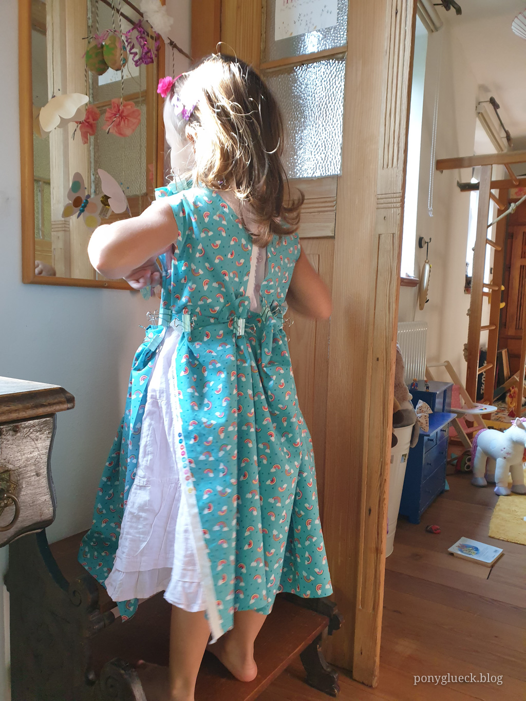 Es ist ein Balance-Akt, ihr etwas beizubringen. Sobald sie spürt, dass ich etwas vor habe, gerät sie in Stress und dann war’s das mit denken und lernen. Schafft man es, eine entspannte Situation zu schaffen und hat man die Geduld, das Ende der „oh mein Gott, sie will was von mir und ich weiß nicht was, ich muss jetzt gleich sterben“ Phase abzuwarten, dann ist es möglich, ihr etwas beizubringen. Noch besser lernt sie aber „on the Job“. Im Sommer 2023 war mein Mann mit unserer Tochter im Urlaub und in dieser Woche habe ich es (auch aus Zeitgründen) zur Gewohnheit gemacht, sie zum Pferde raus bringen und rein holen mitzunehmen. Die Abläufe hat sie (an der Leine geführt) so sehr verinnerlicht, dass ich sie heute auch ohne Leine mitnehmen und körpersprachlich anleiten kann. Dafür mussten wir keine Kommandos lernen, sie hat es einfach verstanden.