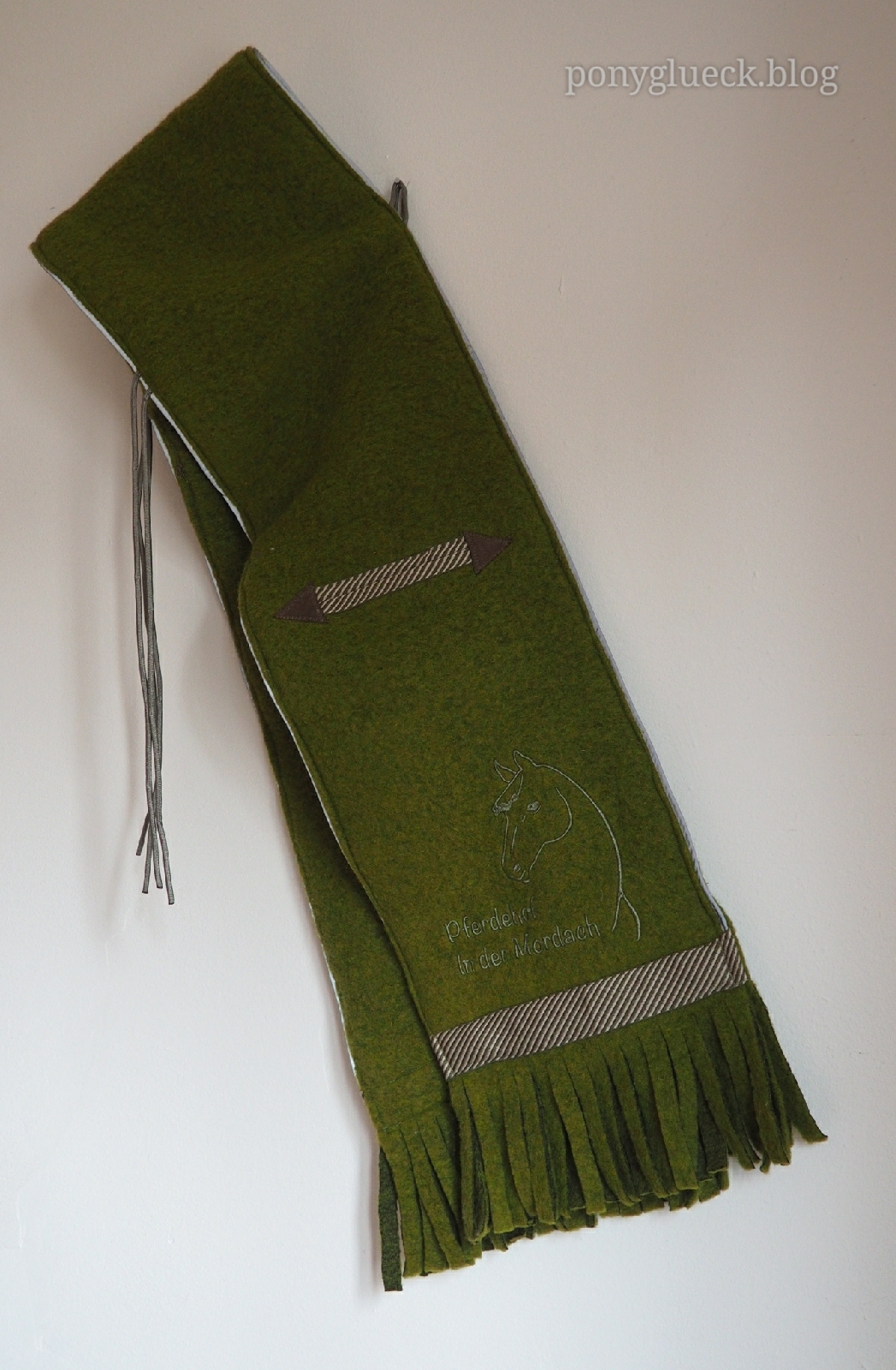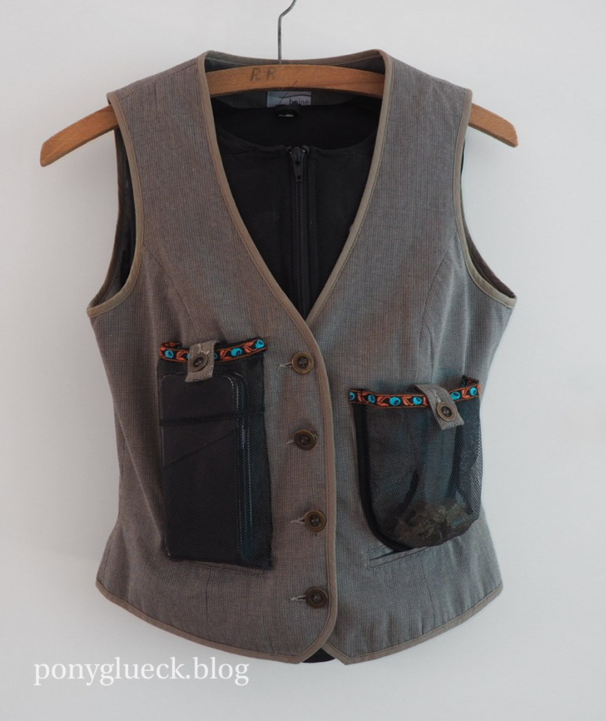 Beim Absteigen ist der Latz abgegangen und irgendwie auf dem Sattel liegen geblieben. Das hat mich zum Einen sehr beruhigt, denn wenn man unfreiwillig absteigt (also vom Pferd stürzt) würde man zumindest mit dem Latz nicht am Pferd hängen bleiben. Zum Zweiten hat es mich auf die Idee gebracht, den Latz noch ein kleines bischen zu modifizieren, so dass man ihn als behelfsmäßigen Sattelregenschutz nutzen kann, wenn man das Pferd ein Stück führen möchte. Dazu habe ich mittig am Bund vom Latz ein Haargummi festgenäht. Damit kann man den Latz am Sattelhorn festmachen. Zusätzlich habe ich am Saum vom Latz ein Gummiband eingenäht, dieses lässt sich über das Cantle (Hinterzwiesel) streifen und gibt dem Latz hinten etwas Halt.