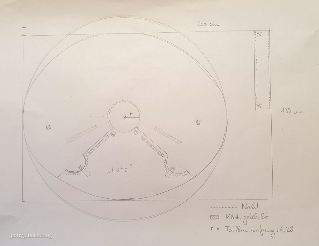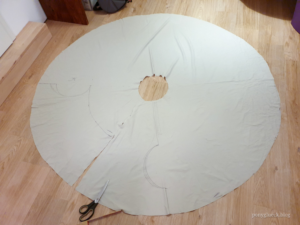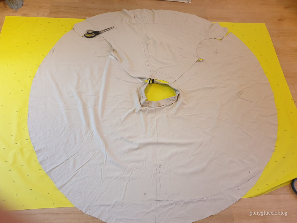 Zunächst habe ich ganz viel YouTube geschaut, alle möglichen Reitrock-näh-Tutorials. Irgendwo hieß es: Taillenumfang geteilt durch 6,28 ergibt den Radius für das Loch in der Mitte. Bei mir hat das irgendwie hingehauen.