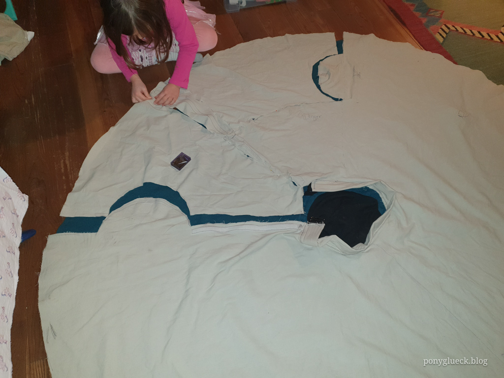 Dummerweise war ich mit meiner kleinen Tochter im Stoffgeschäft, so dass ich, bevor es mit meinem Reitrock weiter ging, erstmal ein Einhorn-Kleid nähen musste…
