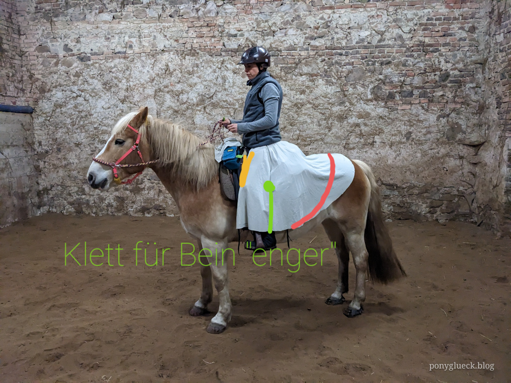 Es ist sinnvoll, sich mit dem halbfertigen Rock schon mal auf’s Pferd zu setzen und zu schauen, ob alles sitzt. Zum Beispiel habe ich die beiden langen Klettbänder am Latz zu Hause aufgeklebt, die beiden Klettbänder am Rock selbst aber direkt auf dem Pferd sitzend. So schließt der Klett in der sitzenden Position optimal.