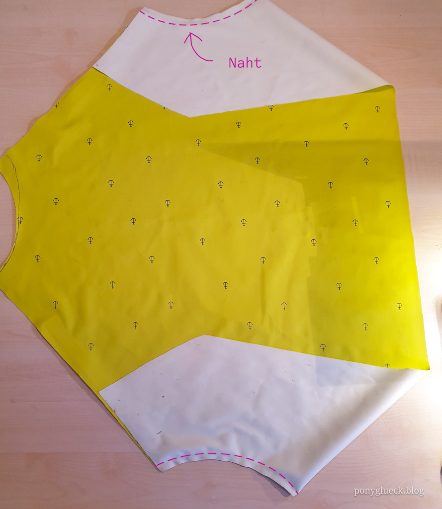Den Ausschnitt von den beiden Halbmonden am Latz (das sieht man auf dem Bild ganz schön, dass der offen ist und meine Tasche rauslugt) habe ich zugenäht. Auf der Schnittmusterzeichnung ist das die kleine Wellenlinie. Das ergibt dann zwei „Tütchen“, das sieht merkwürdig aus, ist aber in der Praxis nicht schlecht: