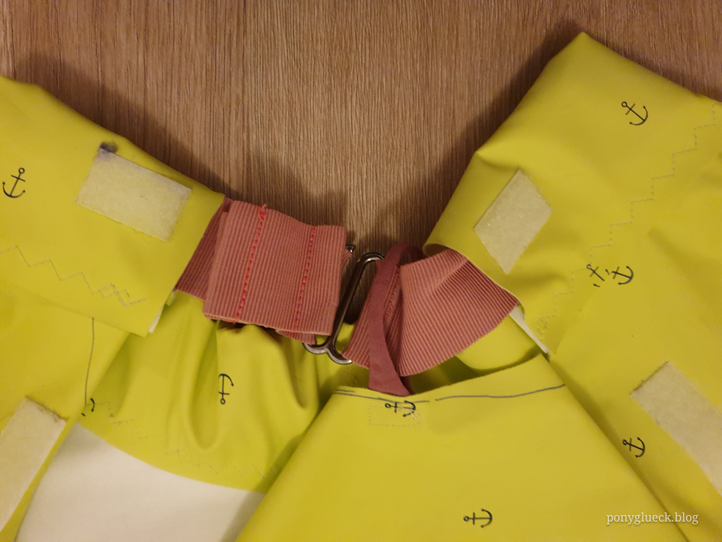 Fast alle Klettbänder sind geklebt, mal schauen, wie lange das hält. Wenn man sie aufnähen möchte, muss man Nahtversiegelungsband verwenden, damit die Naht wasserdicht ist. Wie das geht, konnte mir nicht mal die unfassbar nette und geduldige Fachverkäuferin im Geschäft erklären, deshalb habe ich das erstmal gelassen.