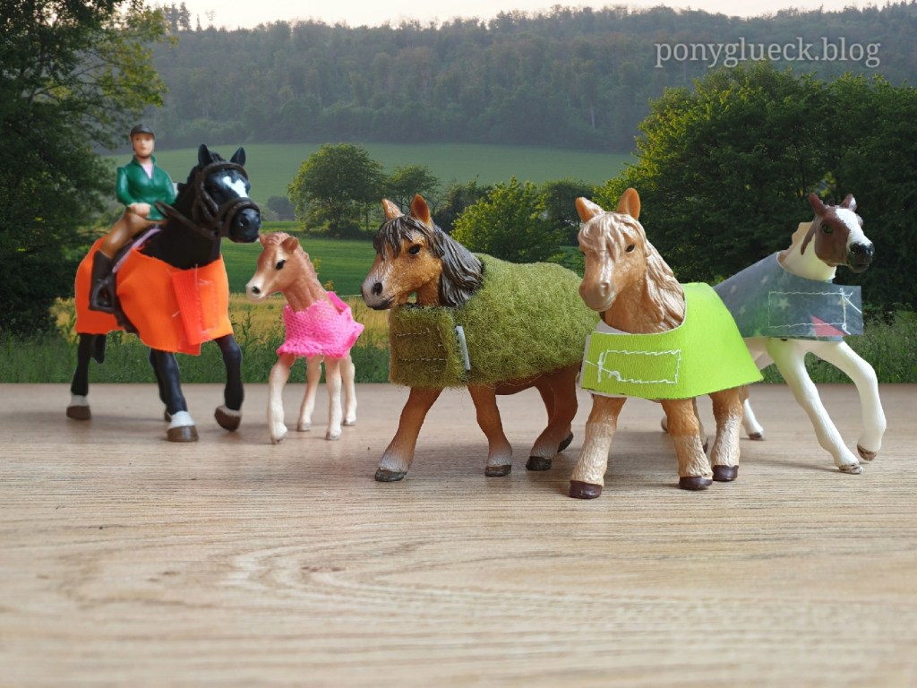 Zuschneiden und nähen muss zwar noch ich, aber die Stoffe und farbigen Klettbänder aussuchen und entscheiden, welches Pony welche Farbe trägt, das kann Thekla mit ihren 4 Jahren schon ganz hervorragend.