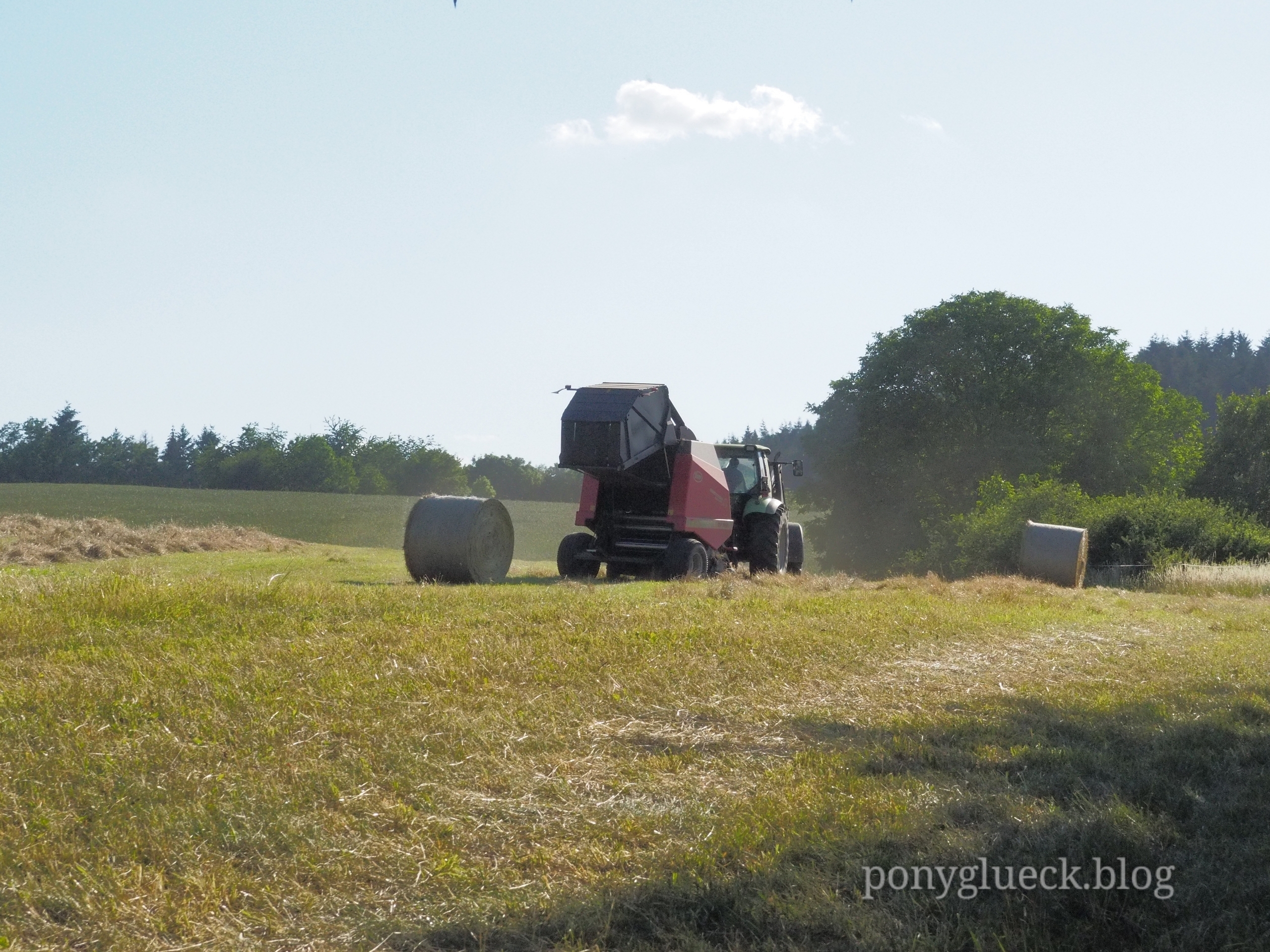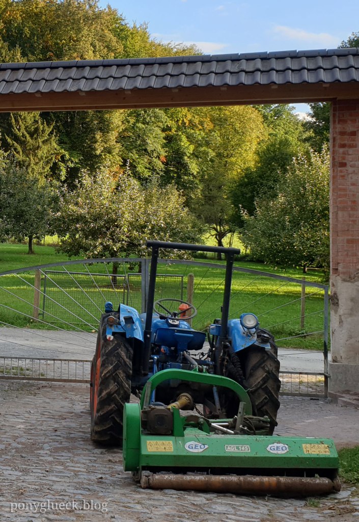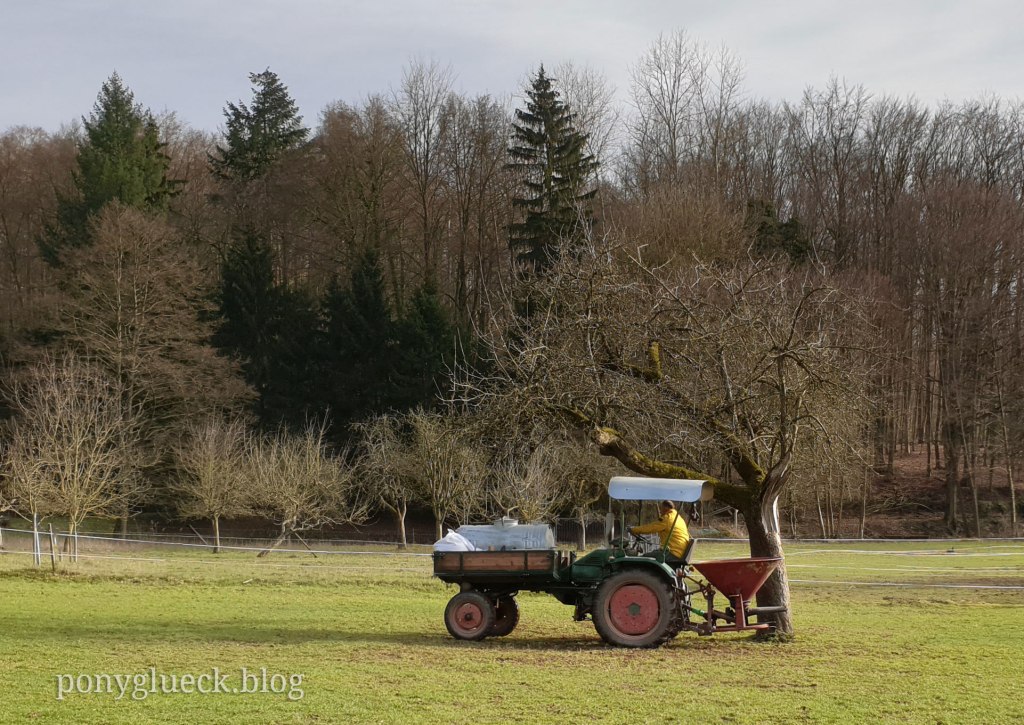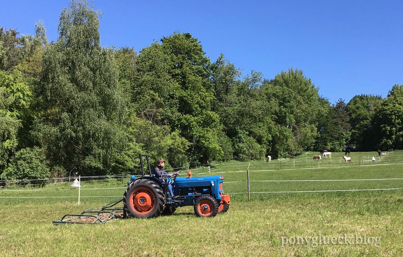 Während der Weidesaison füllen wir täglich die Wasserbottiche auf und kontrollieren die Zäune. Wechseln die Pferde auf das nächste Stück, so wird die alte Weide abgezogen, um die Pferdeäpfel zu verteilen und „Geilstellen“ zu vermeiden (Abäppeln wäre natürlich besser, aber das bekommen wir zeitlich nicht hin). Ich habe immer ein Lächeln im Gesicht, wenn mein Mann mit unserem Dexta, den wir zum Abziehen nutzen, um die Ecke kommt. Irgendwie erinnern mich die Beiden and die Kinderserie „Kleiner roter Traktor“.