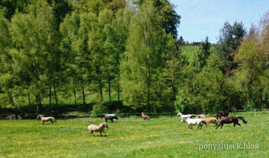 Sobald wir das Gefühl haben, dass das Gras gut wächst und die Witterungsbedingungen passen, geben wir ein Stück Wiese zum Anweiden an der Hand frei. Hier können unsere Einsteller beginnen, empfindliche Pferde an das frische Grün zu gewöhnen. Etwa 2 Wochen später geht es dann für alle Pferde auf die Weiden. Hierbei hat sich in den letzten Jahren folgendes Vorgehen bewährt: Am ersten Tag gehen die Pferde am Morgen auf die Winterstücke. Hier fressen sie Heu, damit sie schon mal ordentlich was im Bauch haben und nicht eventuell noch kaltes Gras gierig herunterschlingen. Um 14 Uhr dürfen sie auf die Weide. Welch eine Freude jedes Jahr! Alle Einsteller, die es ermöglichen können, kommen zum Zuschauen, alle Anderen werden über unseren Verteiler mit Videos versorgt. Nach 2 Stunden geht es zurück in den Stall. Dies wiederholen wir 7 Tage lang, wobei es jeden Tag eine halbe Stunde früher auf die Weide geht. Ab dem 8. Tag geht es gleich morgens auf die Weide.