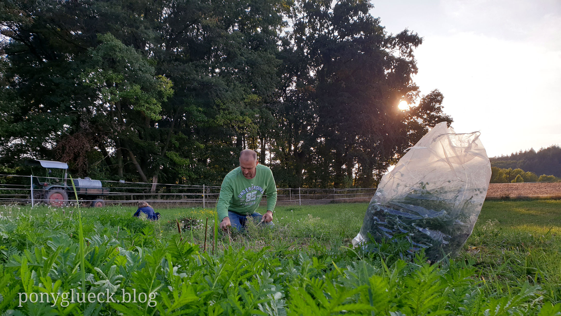 Unerwünschter Bewuchs wird entweder regelmäßig gemulcht (z.B. Brennnesseln) oder von Hand entfernt (z.B. Ampfer). Der Mulcher ist ein beweglicher Mäharm, der hinten an den Traktor gehängt wird. Dieser schneidet und zerkleinert das Schnittgut. Brennnesseln wachsen weniger nach, wenn sie regelmäßig geschnitten werden und auch andere Pflanzen, die die Pferde nicht fressen, vermehren sich durch regelmäßiges Schneiden weniger. Da Ampfer schnell viele Samen bildet, entfernen wir ihn vorsichtig von Hand, damit wir beim Abziehen oder Mulchen nicht noch unfreiwillig die Samen großflächig verteilen. Wenn wir Glück haben, muss sich gerade ein junger Mensch sein Taschengeld aufbessern, aber besonders beliebt ist das Ampfer schneiden nicht, so dass wir es doch meist selbst machen müssen.