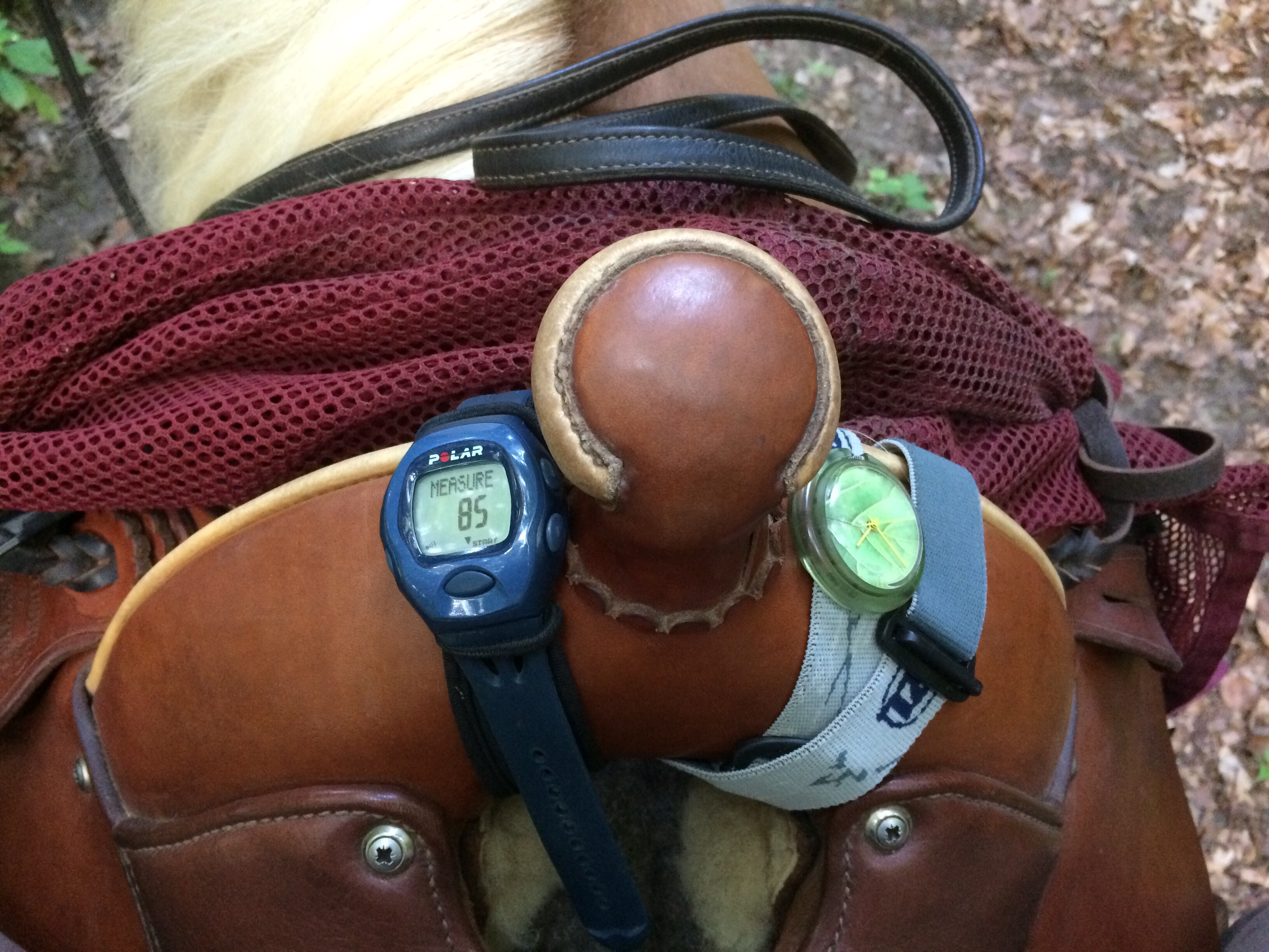 Auch mit sorgfältigem Anfeuchten von Pferd und Sensoren liefert das Pulsmessgerät erst mal keine Werte (Pony ist halt ein kleines Heizöfchen und schnell wieder trocken) und der Sensor, den man am Schulterblatt unter den Sattel schiebt, rutscht dauernd raus. Also schon mal kein Wert für den Ruhepuls. Die ersten Werte sind dann auch ziemlicher Quatsch (158 Schläge pro Minute im ruhigen Schritt auf ebener Strecke?!?), aber daran habe ich mich schon gewöhnt (ist ja nicht mein erster Versuch). Nach 30 Minuten ist Pony zart angeschwitzt, der Sensor sitzt, das Pulsmessgerät liefert einigermaßen plausible Werte. Ich versuche, ein Gefühl dafür zu bekommen, welchen Puls in welcher Gangart sie hat. Hier ergibt sich die nächste Hürde: meine Augen sind im letzten Jahr echt schlecht geworden, spätestens im Trab bräuchte ich eigentlich eine Lesebrille, um auf dem Pulsmesser noch überhaupt irgendwas zu erkennen, von Galopp will ich garnicht reden und die Uhr kann ich auch kaum lesen. Das wirft die Frage auf: investiere ich als nächstes in eine Gleitsichtbrille oder in ein Pulsmessgerät, das die Werte per Sprachausgabe mitteilt und überhaupt mit dem Smartphone kompatibel ist. Soweit ich es erkennen konnte, steigt der Puls in Schritt und Trab eher nach Steigung des Weges als nach Gangart: ebene Strecke oder bergab ca 60-70, leichte Steigung 90-100 Schläge pro Minute. Ob und wann der Puls sprunghaft ansteigt, kann ich beim besten Willen nicht erkennen.