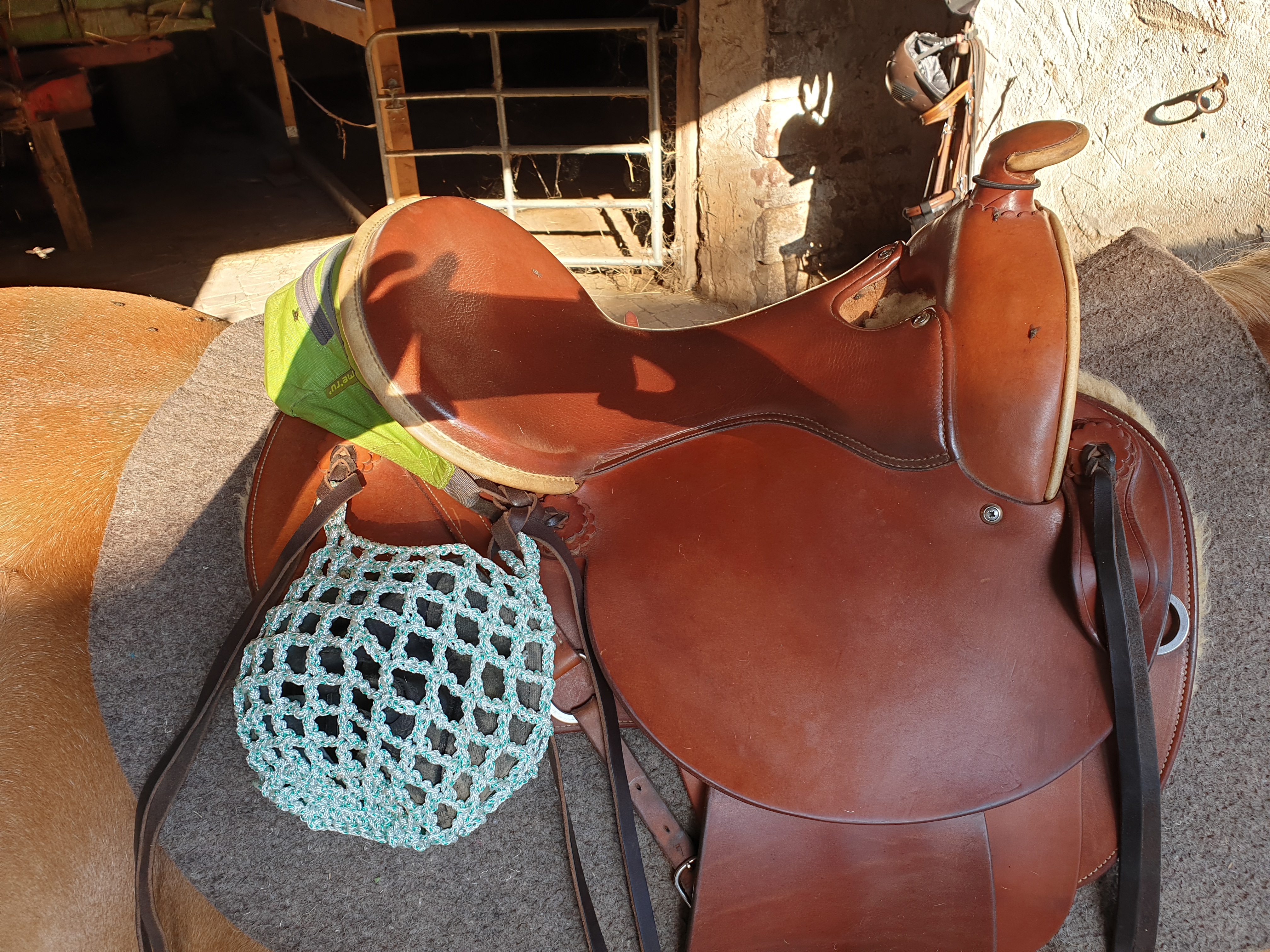 Da Bonni „nur“ Handpferd war, bzw. geführt wurde, hat ein einfaches Stallhalfter mit einem langen Baumwollstrick völlig gereicht.