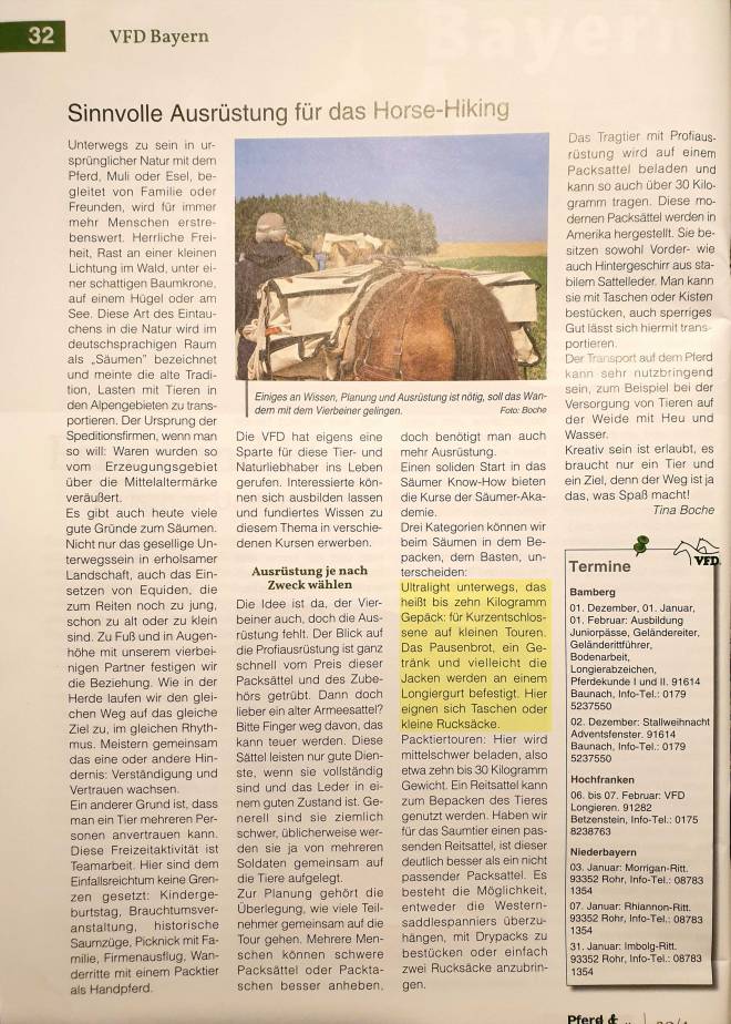 In der Verbandszeitschrift der VFD „Pferd & Freizeit“ habe ich den nachfolgenden Artikel „Sinnvolle Ausrüstung für das Horse-Hiking“ von Tina Boche entdeckt, der sehr schön zu meinem kleinen Erfahrungsbericht passt und ihn perfekt ergänzt. Ich freue mich sehr, den Artikel mit freundlicher Genehmigung der VFD Bayern (http://www.vfd-bayern.de/) hier anfügen zu dürfen.