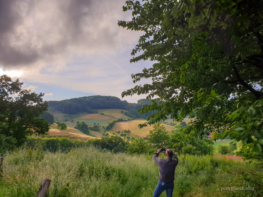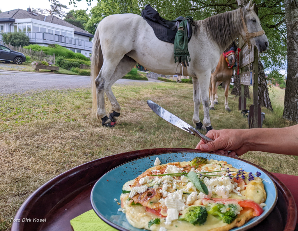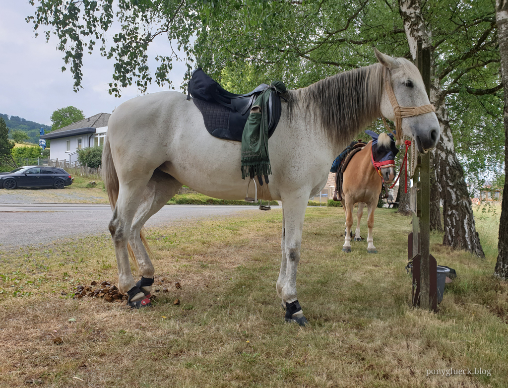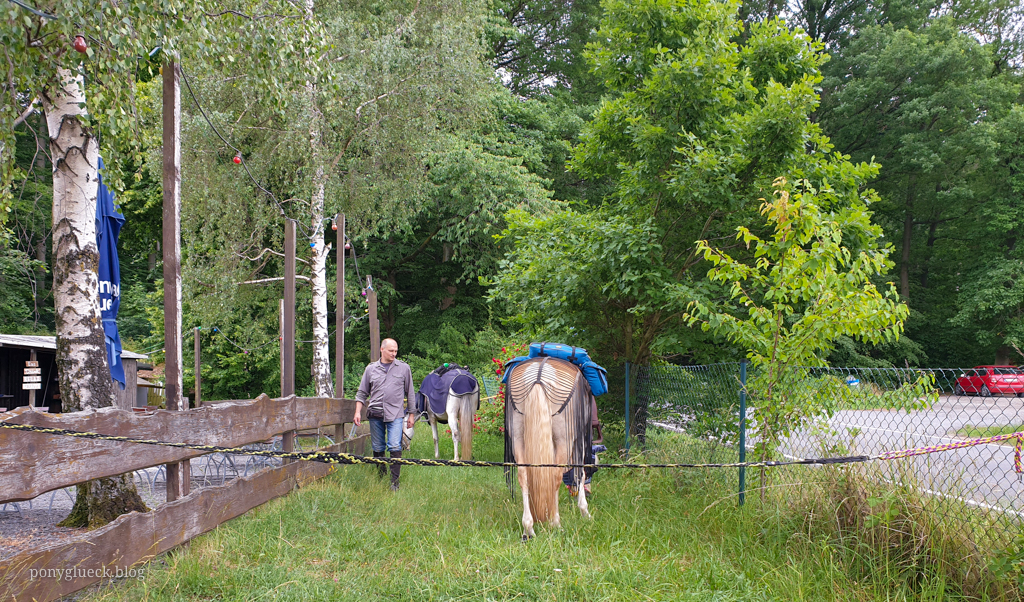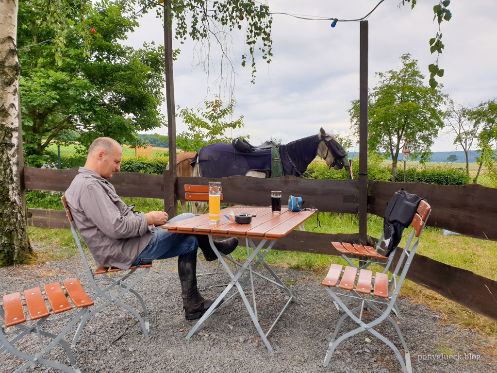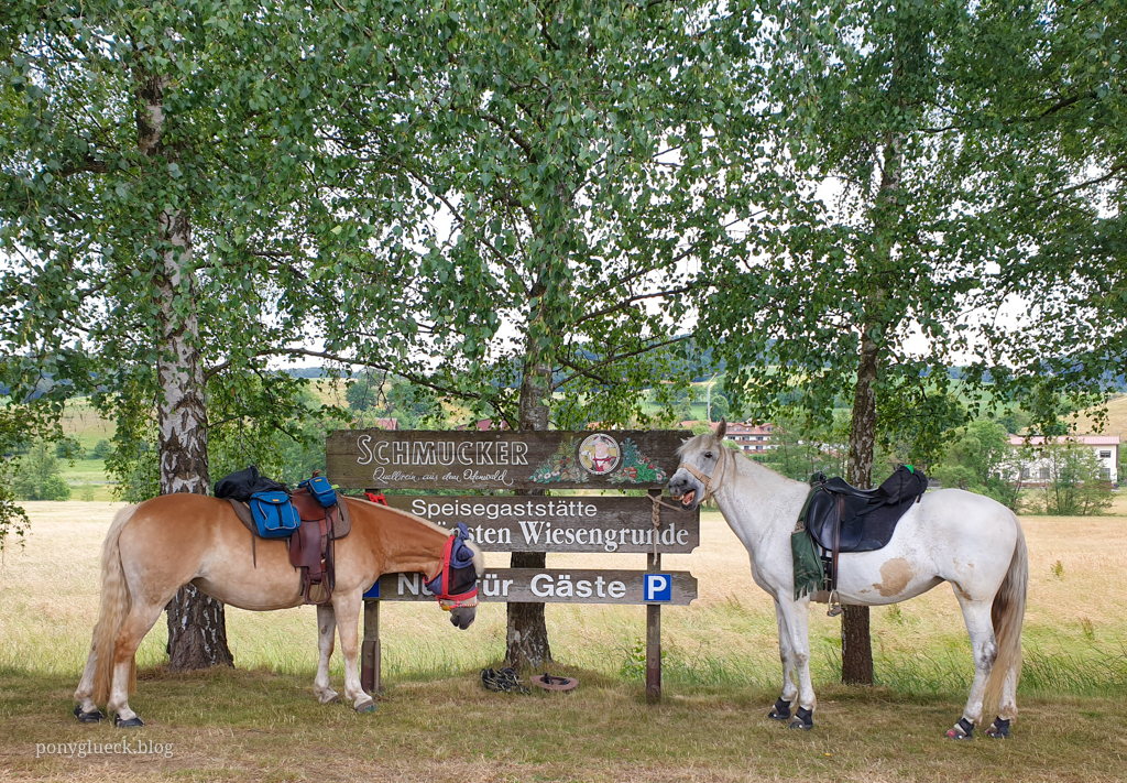 Für die Mittagspause hatte ich den Landgasthof „Zum schönen Wiesengrunde“ ausgewählt. Eine gute Wahl, die Inhaberin hat sich wirklich außergewöhnlich viel Mühe gemacht: einige Tage im Voraus hat sie beim Landwirt nachgefragt, ob wir die Pferde auf seiner Wiese grasen lassen dürfen (durften wir nicht, die Wiese stand kurz vor der Heuernte, da hätte ich auch niemanden drauf gelassen). Also haben wir die Ponys ein paar Kilometer vorher sich satt futtern lassen (an einer garantiert nicht bewirtschafteten Waldlichtung) und haben sie am Landgasthof auf dem Parkplatz geparkt.