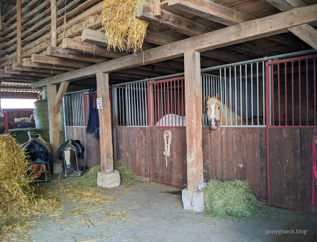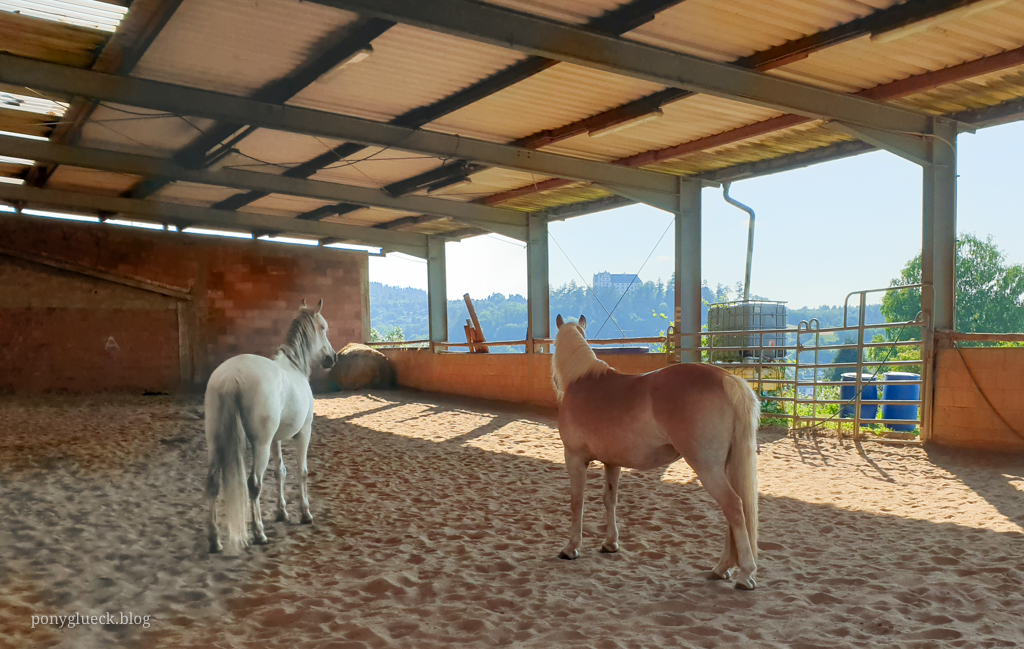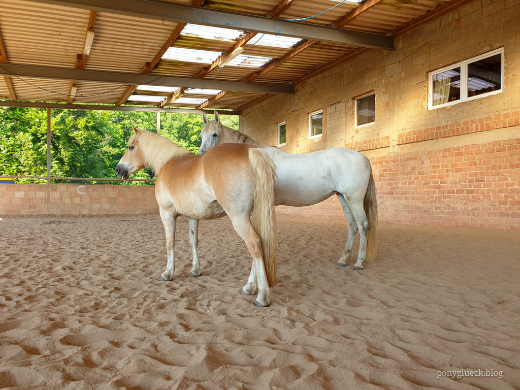 Auf der Tannehof-Ranch haben wir uns sehr wohl gefühlt. Wir wurden freundlich empfangen und es war alles da, was wir brauchten. Zwei Boxen waren üppig mit Stroh und Heu ausgestattet und unsere Ponys haben gesoffen, gefuttert und sich zum Schlafen abgelegt. Das Heu war von sehr schöner Qualität und wir durften es für unsere beiden Hustenponys anfeuchten. Auch die Reithalle durften Tammi und Bonni zum Wälzen nutzen.