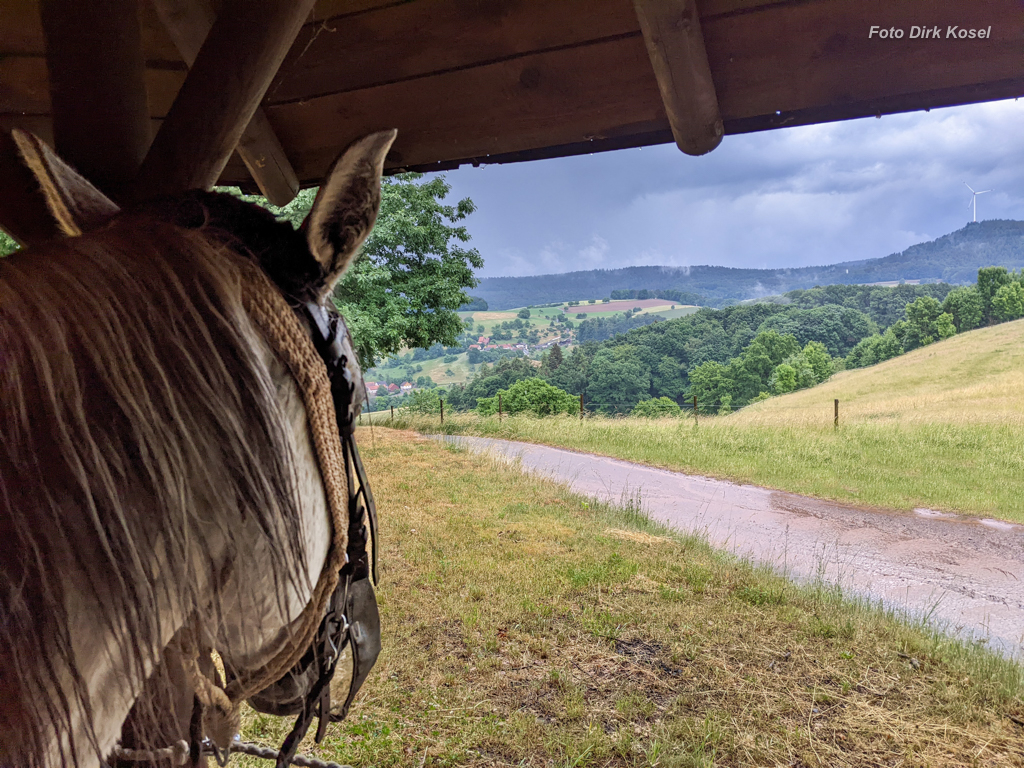 Nachdem wir die Ponys mit Kraftfutter, Heu und Wasser versorgt hatten, gab es für uns Frühstück. Petrus war wild entschlossen zu prüfen, ob meine Packliste für alle Wetterlagen das Passende bereit hält: nach dem sonnigen Tag gestern war Regen angekündigt, so dass die Fliegendecken in die Packtaschen mussten und das Regenzeug obenauf. Hat alles gepasst und die Ponys waren beim Satteln und Packen vorbildlich!